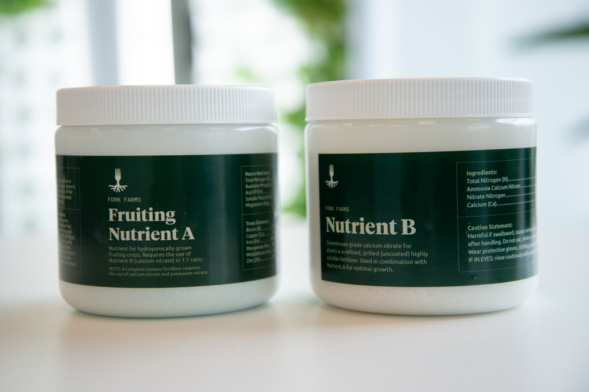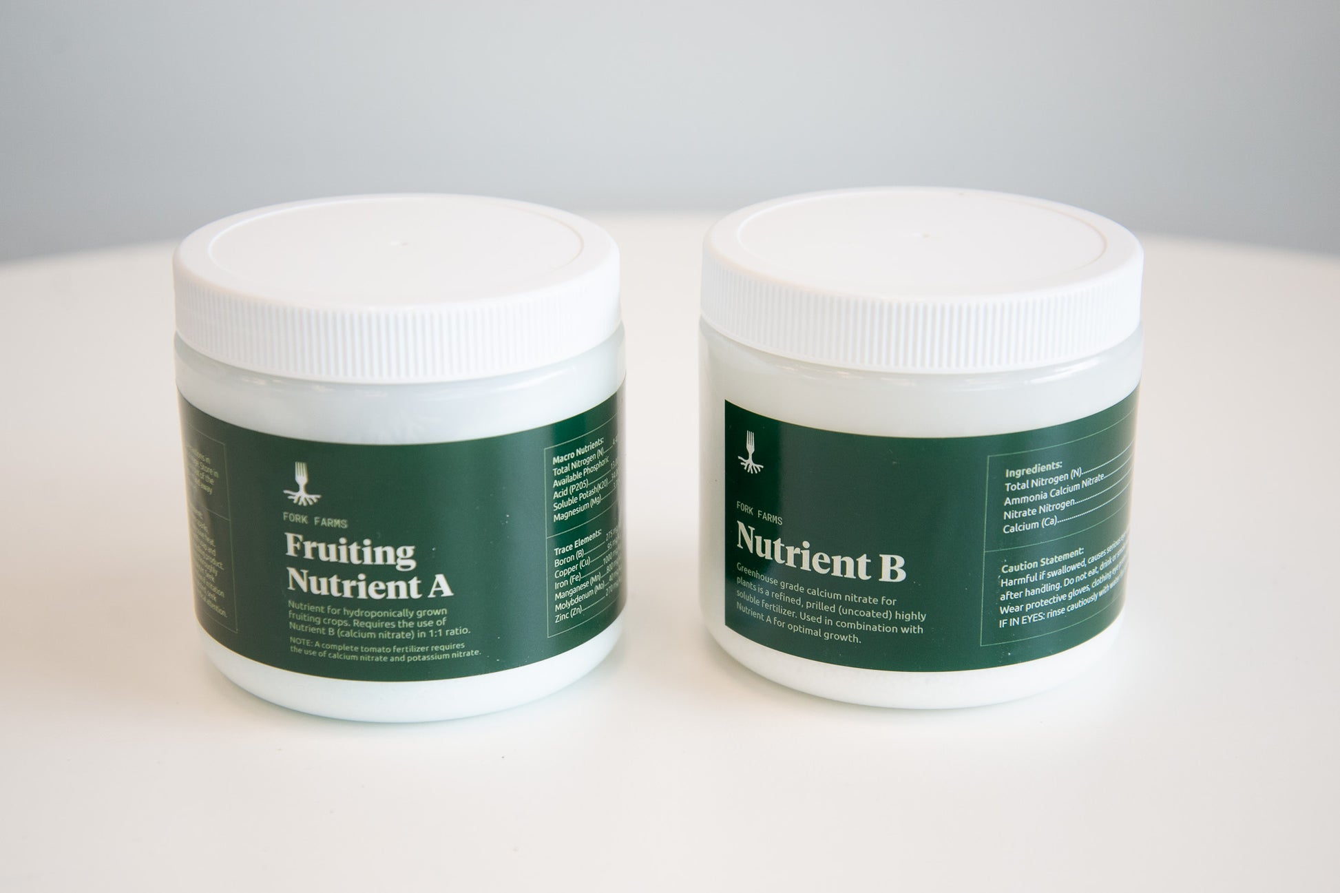 Fork Farms hydroponic nutrients for growing quality fruiting plants in the Flex Farms. Fruiting Nutrient A and Nutrient B are used in a 1:1 ratio to provide plants with the essential micro and macronutrients for optimal growth.